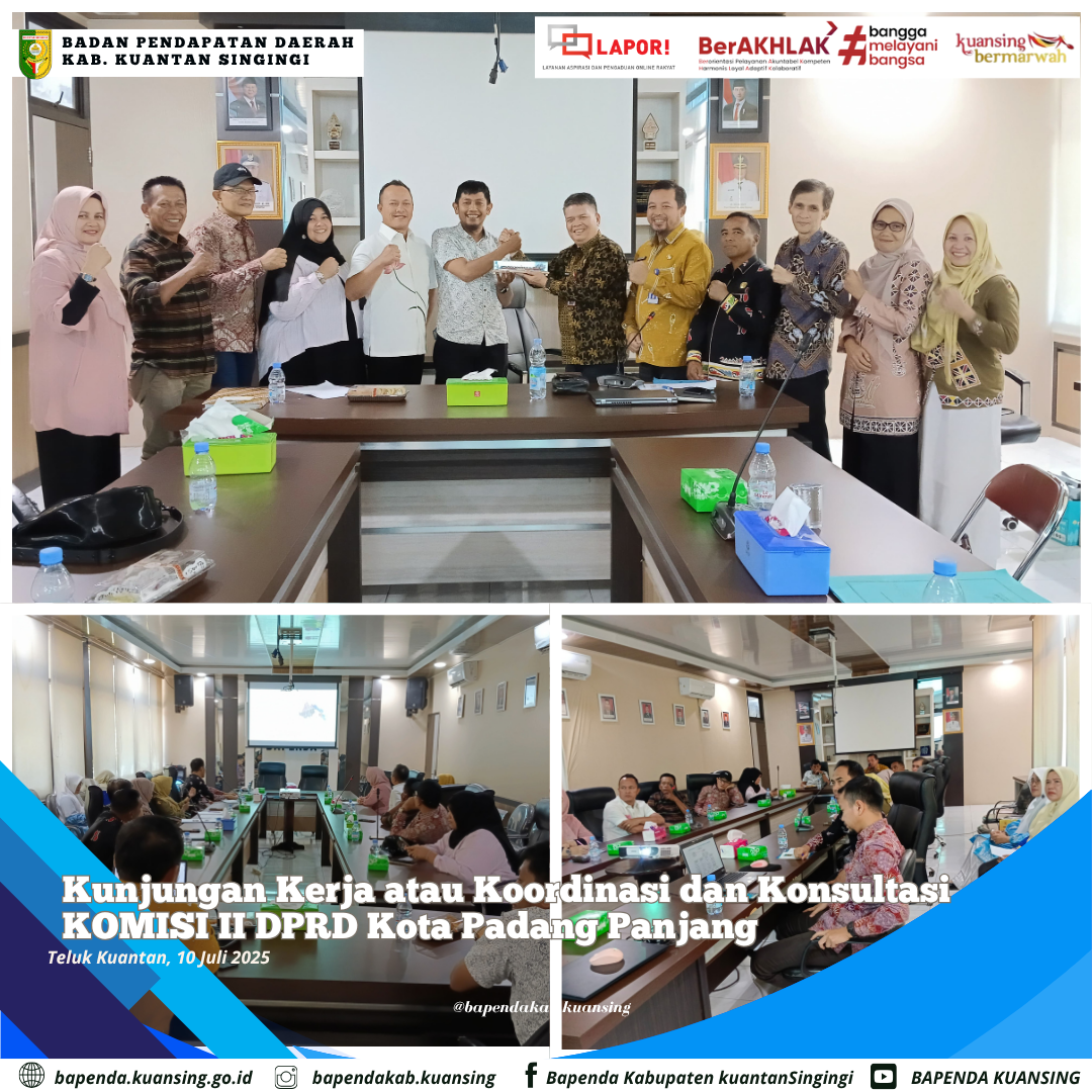 Komisi II DPRD Kota Padang Panjang, Provinsi Sumatera Barat melakukan kunjungan atau koordinasi dan konsultasi ke badan Pendapatan Daerah Kabupaten Kuantan Singingi, Provinsi Riau.